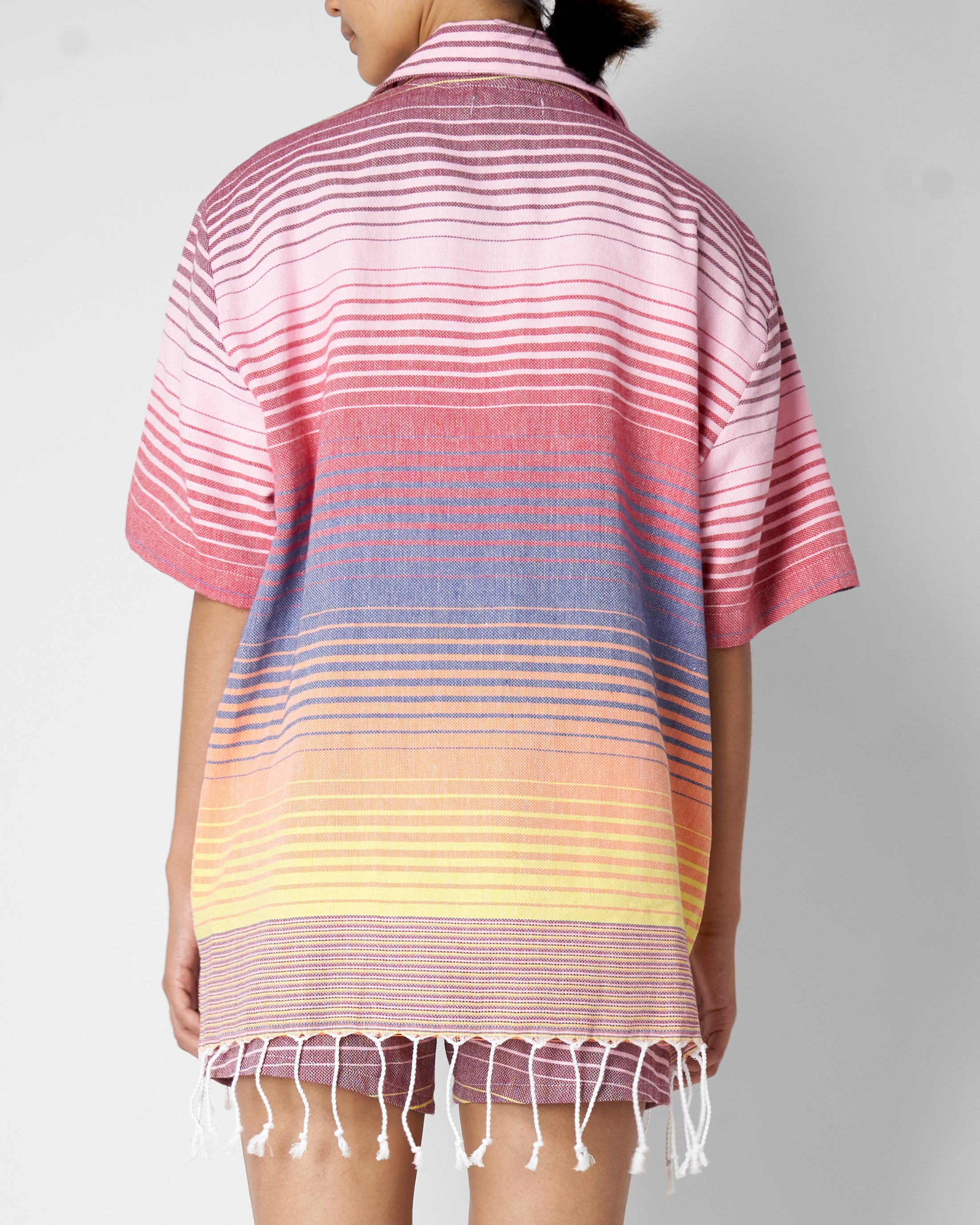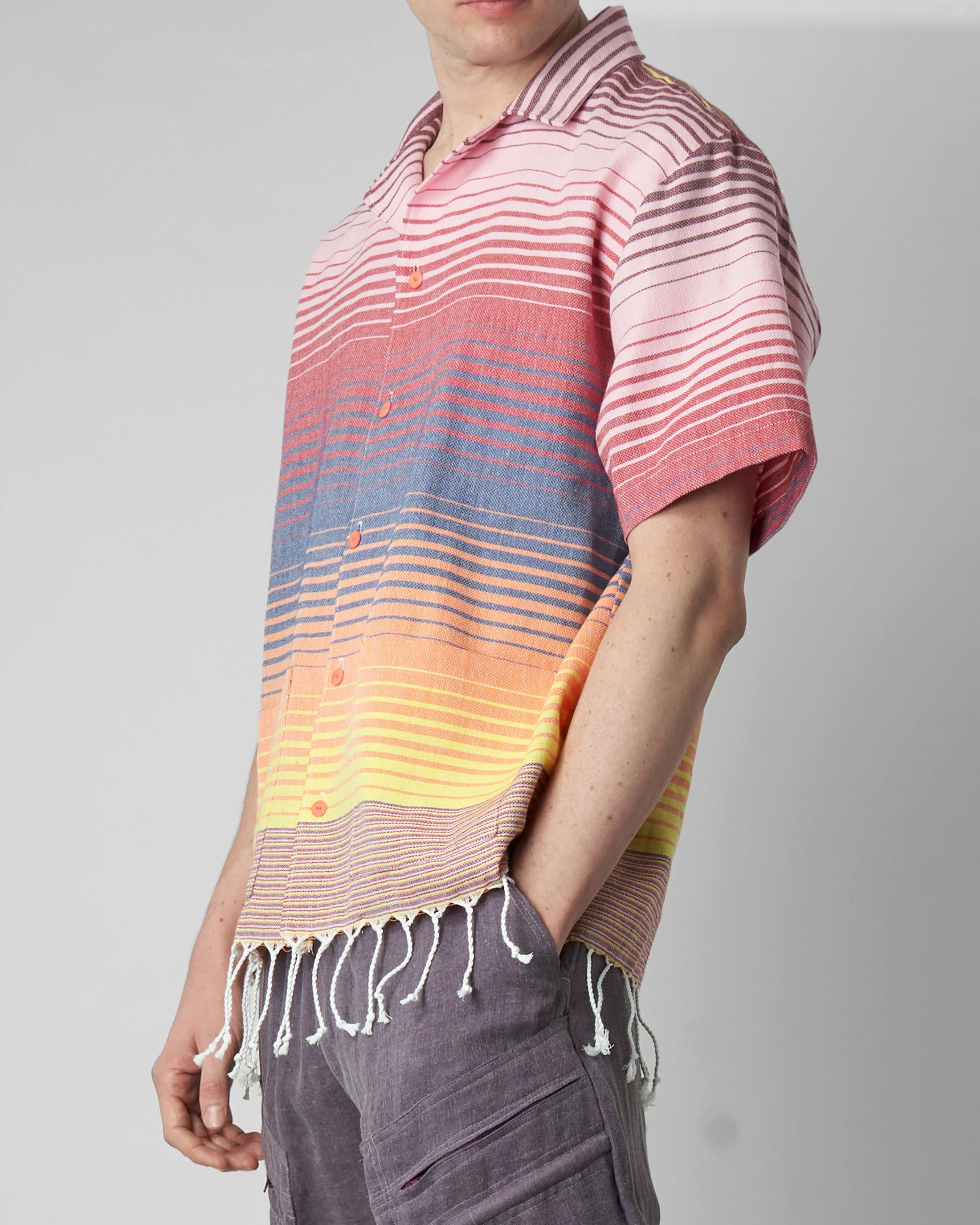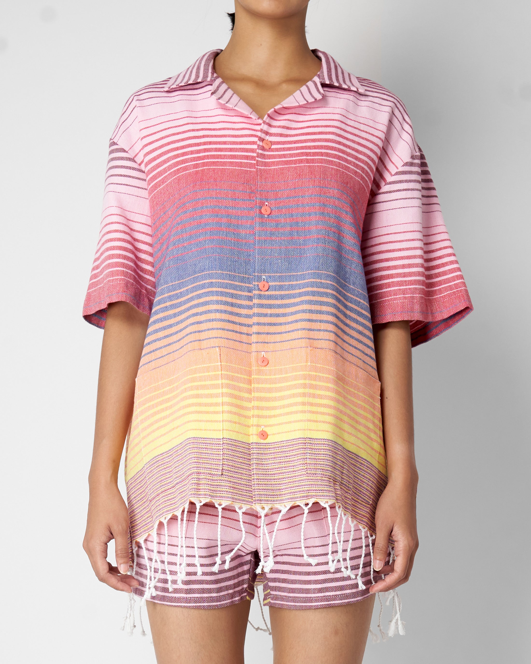The Wylie Shirt is cut with a relaxed, boxy shape and short sleeves. Camp collar. Natural corozo buttons. Dual front patch pockets. Fringed hem.